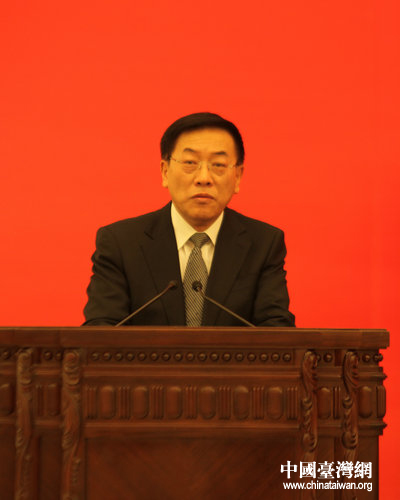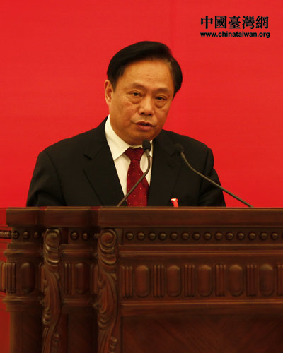 中华全国台湾同胞联谊会会长梁国扬代表全国台联第八届理事会作工作报告。(中国台湾网 郭莹莹 摄)
