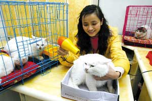 莎莎为洗了澡的猫吹毛发 记者 刘嵩 摄