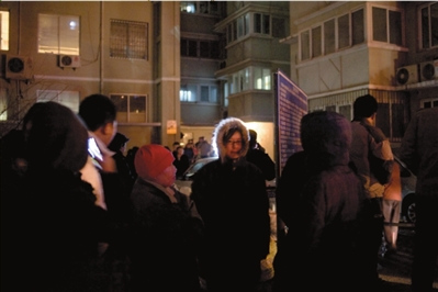 楼内住户被疏散后在小区里顶着寒风等待回家