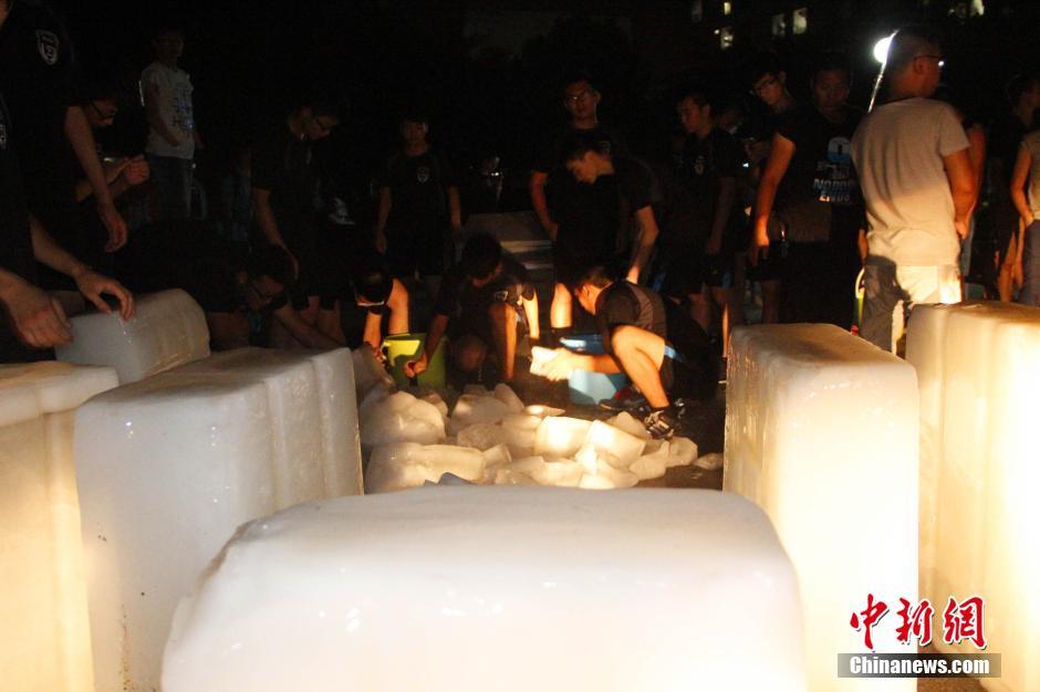6月29日晚,广西大部分地区依然被高温笼罩,地处柳州市的广西科技大学鹿山学院给学生派发冰块降温。当晚,一辆运载约15吨冰块的货车停在该校宿舍楼前,学生们拿着桶、盆排队领取冰块。图为学生们在装冰块。中新社记者 朱柳融 摄