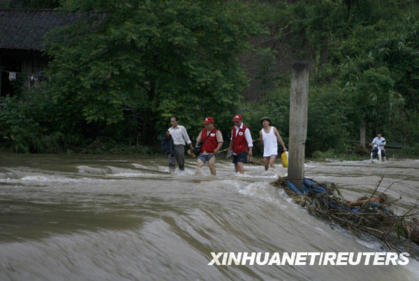 7月6日,在越南北部北件省,红十字会志愿者在被洪水淹没的道路上跋涉。越南防洪指导委员会当日说,肆虐3天的山洪已造成至少20人死亡,18人失踪,越南北部多处道路和房屋损毁。新华社/路透