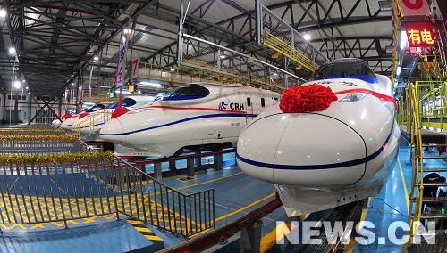12月26日凌晨,在武汉动车基地,准备进行首日运营的动车组整装待发。新华社记者 程敏 摄
