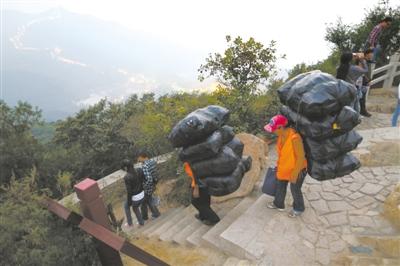 下午5时30分左右,太阳落山,长城上的游客陆续开始散去。此时,清洁工们开始最后一次全面清理。“四楼以上没有灯,天黑了就什么也看不见了,必须抓紧时间下山。”王化金说罢,便帮瘦弱的妻子背上3袋瓶子、1袋垃圾,自己背上了1袋瓶子和3袋垃圾。