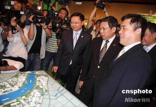 9月22日,“2010上海世界博览会推介会”暨“走进世界博览会”展览活动在台北开幕。出席开幕式的台北市市长郝龙斌(右一)、上海常务副市长杨雄(右二)一起参观上海世博会整体规划展览。 中新社发 陈立宇 摄