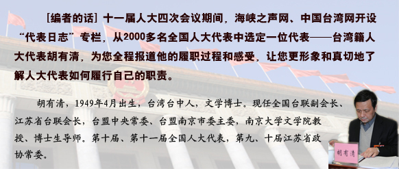 胡有清是大学教授,一直从事教育工作,对于普通百姓关注的教育公平问题,他有自己的看法和建议。在台湾省代表团上午的讨论发言中,他就建议要进一步完善家庭经济困难学生资助保障体系、关于健全完善校园突发事件应急反应机制、关于加大对民办幼儿园扶持力度等问题。他讲到:“国家对家庭经济困难学生非常重视和关心,资助工作非常扎实,得到广大困难学生及其家庭的积极拥护,受到人民群众的广泛称赞和好评,充分体现了社会主义优越性和政府促进教育公平的决心。让更多困难的学生也能获得同等的教育机会,教育资助的具体工作中还需要进一步加强。一是做好困难学生认定工作;二是加强资助力度,扩展资助渠道;三是加强对资助资金的监督,确保资助资金的能够切实用于家庭经济困难学生;四是建立发展型资助体系;五是加强组织建设,提升资助工作水平。”