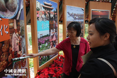 在重庆园博园的彰化景观区,记者团的成员热心向大家介绍家乡的美食。(中国台湾网 杨丽 摄)