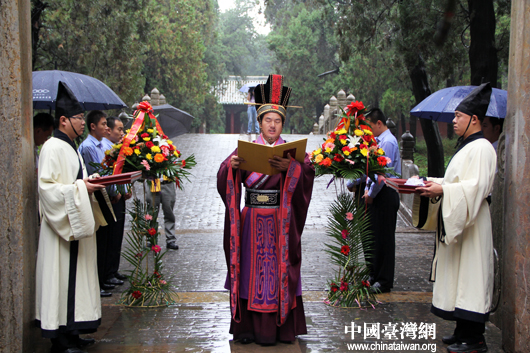 两岸文化界人士雨中祭拜孔子圣人。(中国台湾网 芮益芳 摄)