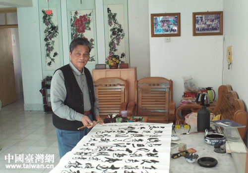 台胞罗承鹏在家挥毫。(图片来源:广西台办)