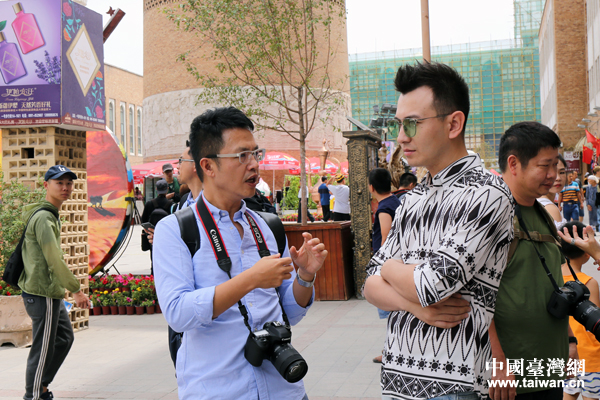 新疆知名网络剧《石榴熟了》主演、自媒体编导热法提·艾尼瓦和台湾美食生活旅游类外景摄影达人温士凯交流新媒体创作。(中国台湾网 王怡然 摄)