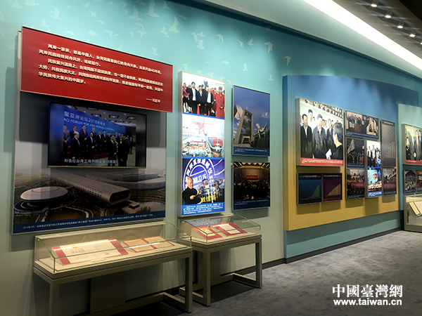 展区展出的记录两岸交流交往重要时刻的图片。(中国台湾网 普燕 摄)