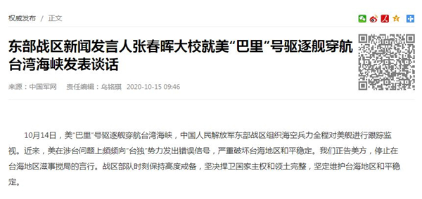 东部战区新闻发言人张春晖大校就美“巴里”号驱逐舰穿航台湾海峡发表谈话。