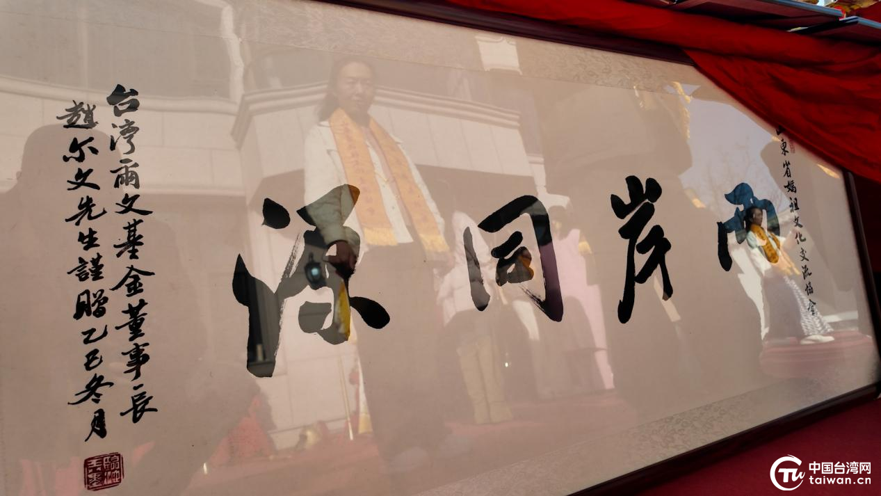 台湾尔文基金会董事长赵尔文先生题赠“两岸同源”牌匾(中国台湾网记者 李鑫 摄)