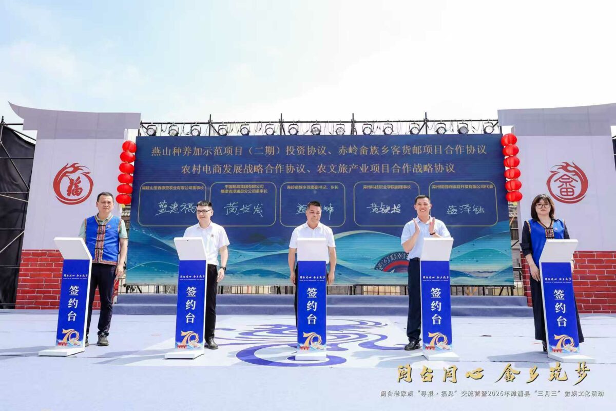 活动中也安排签约仪式共筑振兴梦 文化交流“不止于此”,漳浦县畲族文化研究会、漳州蓝氏宗亲联合贸易有限公司与海内外宗亲签订浦台青年畲族文化交流合作框架协议、海内外宗亲贸易战略合作协议;赤岭畲族乡也与四家单位签约,涵盖农文旅融合、种植养殖加工、电商物流等领域,希望凝聚宗亲力量,为畲乡振兴注入动力。