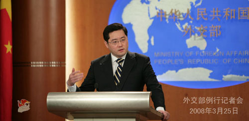 2008年3月25日下午,外交部发言人秦刚举行例行记者会,就近期拉萨发生的打砸抢烧严重暴力犯罪事件等问题答问。