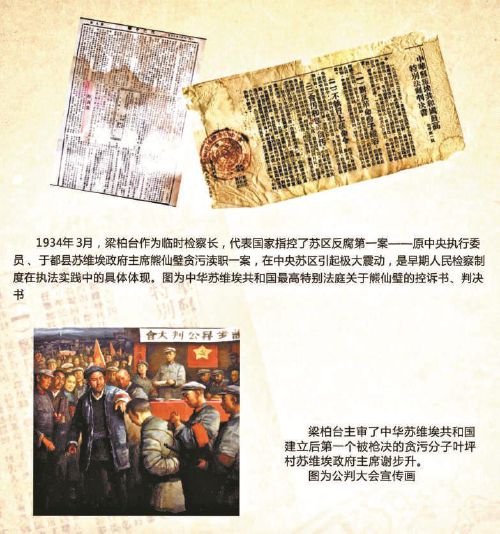 梁柏台,1899年出生于浙江省新昌县,1922年进入莫斯科东方大学学习,同年加入中国共产党。1931年从苏联回国,被派往中央苏区参与建设中华苏维埃共和国红色政权。到红都瑞金后,梁柏台参与中华苏维埃第一次全国代表大会文件起草,执笔起草了《中华苏维埃共和国宪法大纲》。同时,还主持起草了《革命法庭条例》《看守所章程》《中华苏维埃共和国司法程序》等十多部法律法规。梁柏台还先后担任临时政府司法委员会委员、司法人民委员部副部长和部长、最高法庭(院)委员、临时检察长等职,是红色政权的第一位检察长。1935年3月在江西大余牺牲。梁柏台是中华苏维埃共和国法制建设的领导者之一和法律主要制定者,是人民司法的开拓者,其倡导的公开审判、巡回法庭、人民调解等制度,为新中国司法制度的创立发展提供了重要经验启示。