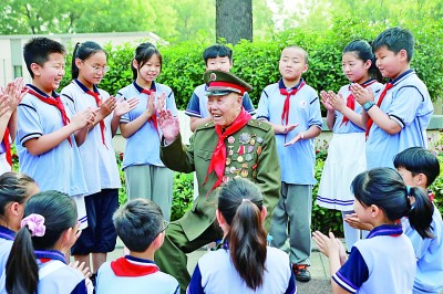 王占山(中)在为河南安阳三官庙小学的少先队员讲战斗故事。