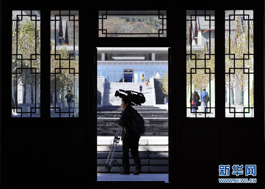 11月3日,记者从北京雁栖湖新闻中心的窗外取景拍摄。雁栖湖新闻中心是2014年亚太经合组织(APEC)领导人会议周将开设的两个新闻中心之一。新闻中心按国际标准提供媒体服务的同时,充分利用本身的建筑特色,尽显中国风格。新华社记者武巍摄
