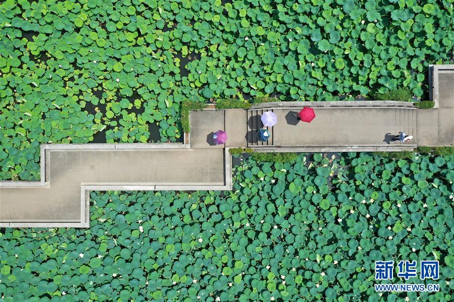 6月27日,游客在湖南省衡阳市石鼓区西湖公园一处栈道上赏花游玩(无人机照片)。 据文化和旅游部公布的端午小长假旅游统计数据,6月25至27日,全国累计接待国内游客4880.9万人次,累计实现国内旅游收入122.8亿元。 新华社发(罗盟 摄)
