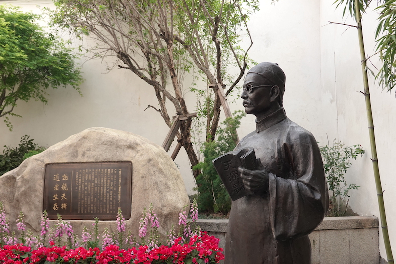 △严复故居里的铜像。他手捧《天演论》,旁边石头上的铜牌写着“物竞天择,适者生存”。(总台央广记者潘毅拍摄)