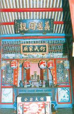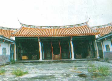 何氏家庙为三进式家庙建筑,最前面是庭院,行二丈余经过左右厢房,才是正厅,单是这一趟脚程就可见家庙之气派。除了院门是现代洗石子建筑之外,牌楼和宗祠正厅都属极秀丽的飞燕式屋脊,脊背弧线弯曲,尾部自然翘起,线条美极了。建材也都属上乘,无论门槛、门楣、窗棱、户枢、梁柱、石板,都非常有价值。只可惜庭院通牌楼的步道两旁,因晚近乏人照料管理,草长及膝,当年宗长们手植的龙眼树也依稀错落在荒烟漫草间,触目所及,景况凄凉而幽深。院门外面对着一畦水塘和无边平畴,在地理上是上好风水,也无怪当初何氏先人要在此设祠了。