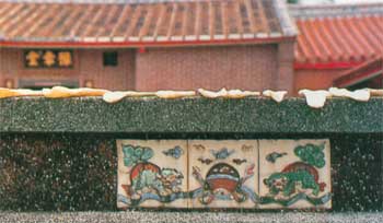 新屋乡九斗罗氏豫章堂,是规格方正的三合院建筑。由于罗氏开台始祖先玉公是一介平头百姓,故祖堂之兴建没有高耸瑰丽的牌楼,也不见前落三川式门厅,更看不到净态飞扬的燕尾屋脊,整个祠堂正身给人的感觉,就像是记忆中的古厝一样,显得朴质无华。祖堂最前面是一堵约一个成人身高的院墙,并在院墙中开设院门(大门)。这面墙倒颇有耐人寻味之年,因为在墙稷和墙基之洗石子上,分别嵌镶了几块彩色瓷砖,和几块菱形图案,瓷砖是早年用白瓷高领土绘图上釉彩烧制而成,砖面随立体图案或曲或直,或高或低,色彩鲜艳至今不退。这几块瓷砖之质感容或不比现代高级磁材,但其手工之细密精巧和花样之变化多端,则远超过任何进口磁砖,嵌之在院墙稷内,随时向过往行人闪耀出沁人的高雅气质,真是罗氏后裔的明智之举。