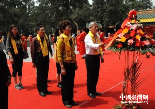 台湾海峡两岸观光旅游协会名誉会长郭蔡文、会长赖瑟珍在曲阜孔庙大成殿拜谒孔子(图片来源:山东省台办)
