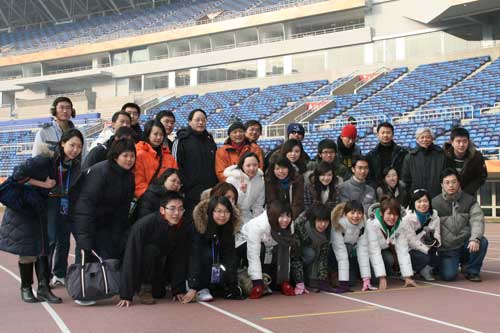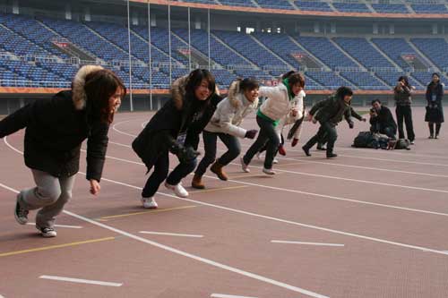27日,中国台联2008年台胞青年冬令营的部分营员走进天津奥林匹克中心体育场,感受这里的奥运氛围。在天津奥体中心,营员们详细了解场馆的建设、设施以及功能、服务等方面的情况,并体验在奥运场地上奔跑。(文/图 田齐)