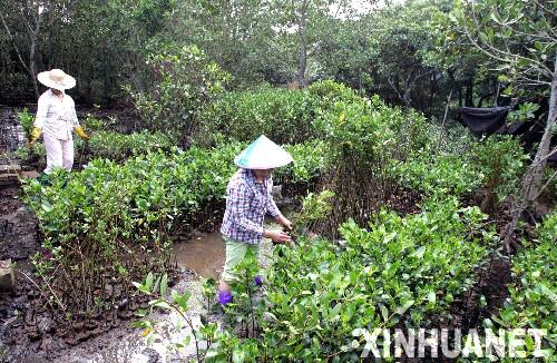 海南省海口市东寨港红树林国家级自然保护区的工作人员在培育红树林幼苗。 新华社记者丁林摄