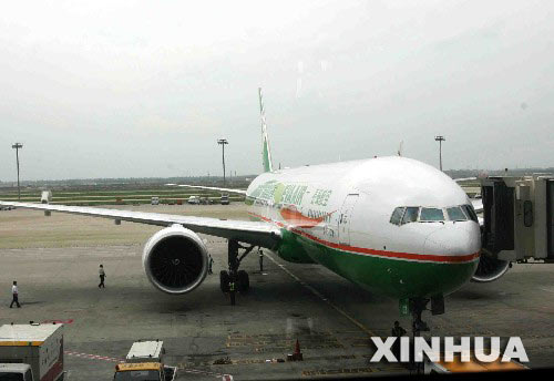 9月29日13时25分许,自台北起飞的台湾长荣航空公司BR1712航班,载着309位乘客抵达上海浦东国际机场。这是2006年两岸中秋包机飞抵大陆的首个航班,标志着两岸客运包机节日化的正式启动。(新华社记者 张明 摄)