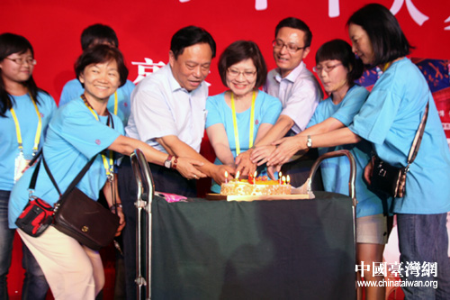 全国台联会长梁国扬参加台胞千人夏令营在北京大学联欢活动,并上台为台胞青年们庆祝生日。(中国台湾网 吴斌 摄)