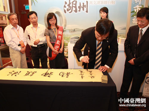 中共湖州市委书记孙文友在大会现场为本市旅游挥毫推荐。(浙江台办王健 摄)