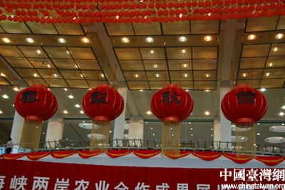 海峡两岸农业合作成果展览暨项目推介会今天(19日)上午在厦门开幕。整个会场融入中国的传统元素,包括中国传统的对联、灯笼,此外结合本次两岸农业合作论坛的主题,凸现农业特色(云鹏/摄影)