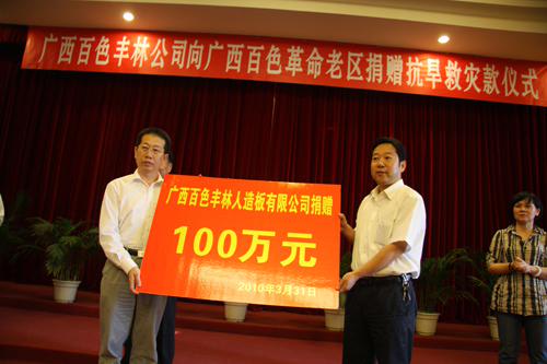 人民网百色3月31日电 (记者庞革平、谢建伟)3月31日下午,香港中国海外集团有限公司和广西百色丰林人造板有限公司分别向广西百色灾区捐款100万元。此前,上海浦东发展银行股份有限公司已向百色市捐款50万元,百色军分区及所属部队官兵则为百色市捐款10.29万元。