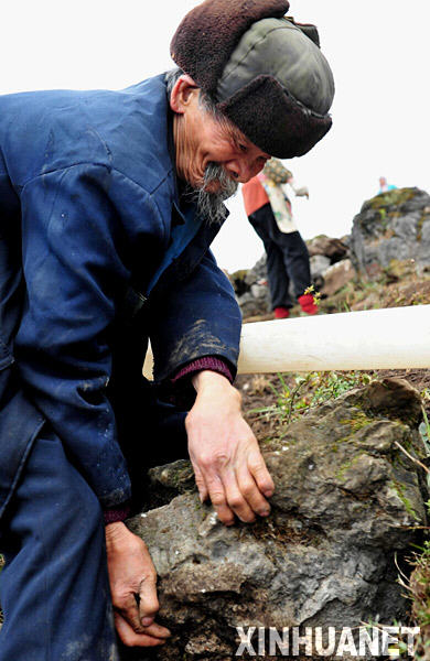 3月24日,在贵州省平坝县城关镇大关村,84岁的杨绍华老人和同村群众一起在新的水源点建水池。贵州省安顺市平坝县城关镇大关村有296户人家,1566人。百年不遇的持续干旱使这个小山村春节前就断了水源。在大灾面前,村党支部书记邱继明自己拿出1.2万元钱,带领全村的群众找到两个水源点,铺设管道,把水引到群众家里。但持续干旱使群众的生活用水只维持到3月10日。断水之后,邱继明又用车为群众运水。3月16日,在距离村子两公里远的大山里找到一处新的水源点后,邱继明又拿出5万元钱,带领全村群众开始建新水池。在大灾面前,邱继明慷慨解囊、一心为民、百折不挠的精神鼓舞和感动着当地的群众,全村男女老少都积极参与修建水池。村民们都说:“再大的灾害不怕,前面有邱支书撑着!”新华社记者杨楹摄