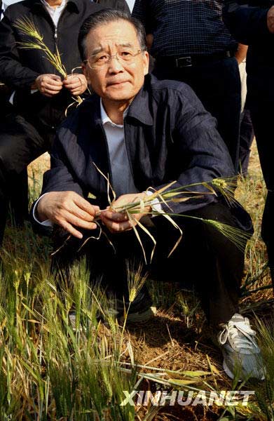 这是3月19日,温家宝来到陆良县芳华镇狮子口村万亩大麦示范田,实地察看农作物受灾情况。新华社记者 姚大伟摄