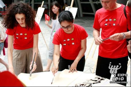 游客跟随塞万提斯学院学员用中文书法写“西班牙语日”的词汇