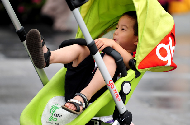 6月29日,一个男孩坐着儿童车里和家长一起游览上海世博园。新华社记者 任军川 摄