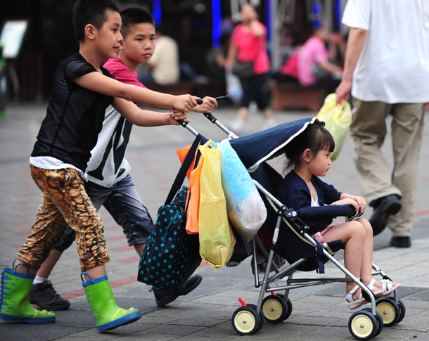 6月28日,两个小男孩推着一个坐在儿童车里的小女孩在上海世博园游览。新华社记者 任军川 摄
