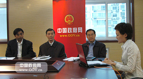 2008年5月14日,中国地震局副局长修济刚、地震预测研究所研究员张国民、中国地震台网中心副主任张晓东接受中国政府网、新华网联合访问,就四川汶川地震相关情况与网友在线交流。图为访谈现场。(中国政府网 郭毅摄)