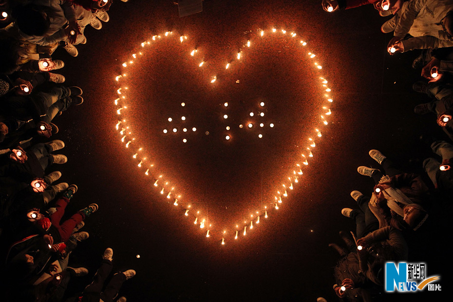 4月20日晚,江苏省南通大学学生在“玉树,我们一直在”祈福活动中点亮蜡烛,哀悼逝者。 新华社发(许丛军 摄)