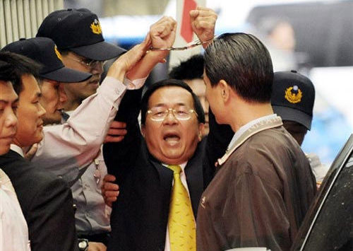 2008年11月11日下午,经过约6个小时的传讯,陈水扁被台湾特侦组送交收押,待台北地方法院裁定。陈水扁步出特侦组激动地高举戴着手铐的双手,大喊“政治迫害、台湾加油”。