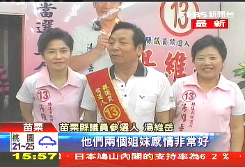 据台湾TVBS电视台报道,苗栗县议员参选人汤维岳,左右手各牵着一个人,高呼胜利口号拜票,不过这两个人,除了是助选员,还有个特殊身份,她们同时都是汤维岳的老婆。