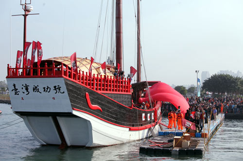 由台南市政府打造的“台湾成功号”,是根据日本平户市松浦史料馆收藏的清康熙年间遗留图形,以1比1方式复原打造,由台当局“行政院文化建设委员会”补助新台币8000万元,2008年11月在安平港区林默娘公园兴建厂房动工,今年5月1日在台南市安平港下水。
