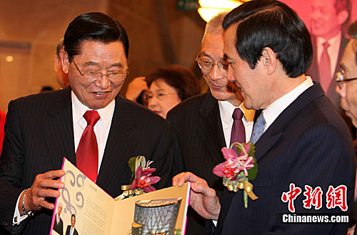 3月9日,台湾海基会在台北新舞台举办“海基双十 两岸双赢”20周年庆祝大会。图为江丙坤(左)向马英九展示海基会成立20周年纪念邮册。中新社记者 董会峰 摄