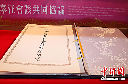 3月9日,台湾海基会在台北新舞台举办“海基双十 两岸双赢”20周年庆祝大会。图为会场外,展示“汪辜会谈”所签协议文本。中新社记者 董会峰 摄