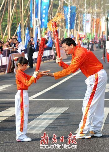 9时50分,张广宁从火种护卫队员手中接过“潮流”火炬,从火种盆中点燃。第一棒火炬手符洪芝从张广宁手中双手接过火炬,广州2010年亚洲残疾人运动会广州火炬传递起跑仪式开始。