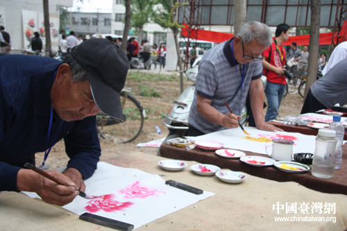中国台湾网5月27日洛阳消息 男女老少画牡丹,幸福生活吉祥如意。这就是5月27日第八届“网上看河南”北线采风团在洛阳孟津县平乐镇平乐村看到的景象。