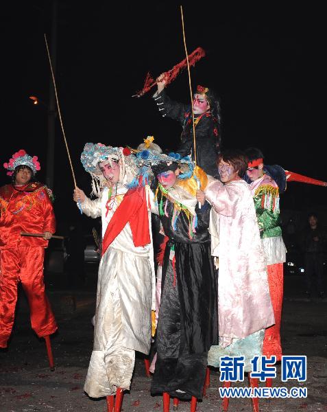 2月16日,在天津塘沽善门村,来自东丽区的青河高跷队正在表演。天津民间花会有600多年历史,在元宵节到来之际,人们通过高跷、宝辇等表演形式,祈盼风调雨顺,营造节日气氛。新华社记者 马平 摄