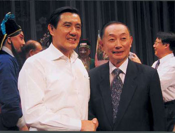 图:马英九观看梅派名剧后上台与梅葆玖握手。(图片来源:大公报)