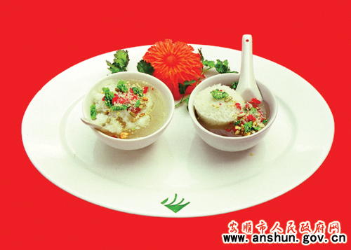 用优质米面、孛荠粉(安顺史载“贡粉”)蒸调制成,佐料为香酥干果仁等,成品香甜软糯。